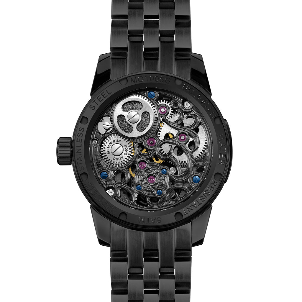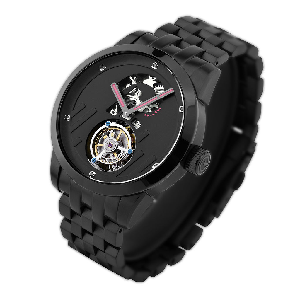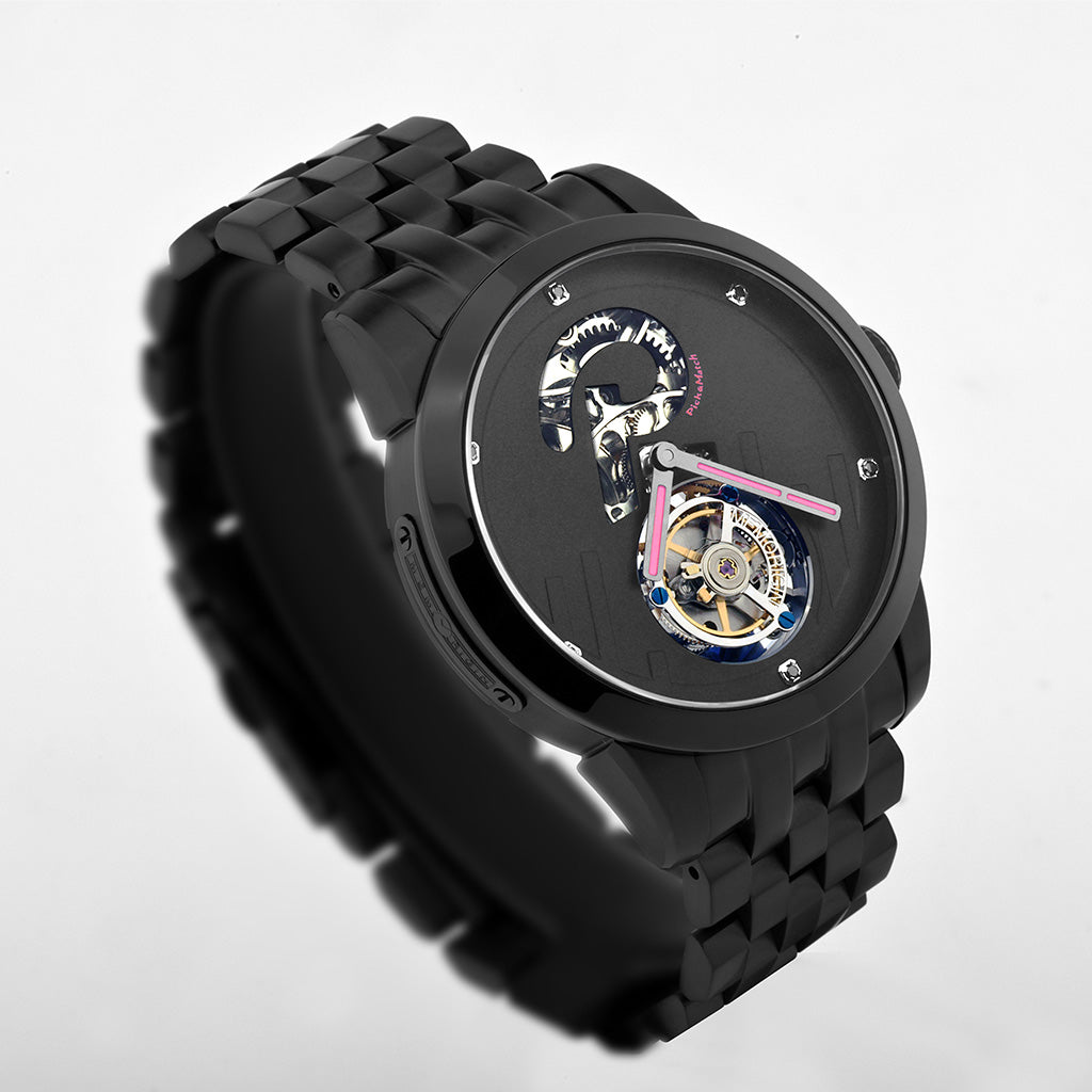 手表型号MO 0910表壳PVD镀黑精钢表壳手表直径:约43毫米手表厚度:约13毫米双面蓝宝石玻璃手表防水:5ATM机芯飞行陀飞轮155件组件及18颗宝石轴承振频:28800次/每小时功能40小时动力储存6时位陀飞轮每转一圈60秒手动上链装置表盘镂空表盘黑钻时间刻度表带PVD镀黑精钢链带